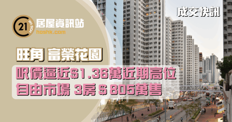 樓市持續轉旺,新近旺角富榮花園錄自由市場成交。世紀21家天下物業富榮花園分行經理黎振傑表示,新近錄得旺角富榮花園成交,單位為8座中層A室,實用面積592平方呎的三房單位,新近獲買家以805萬元(自由市場價) 購入,實用面積呎價13,598元。