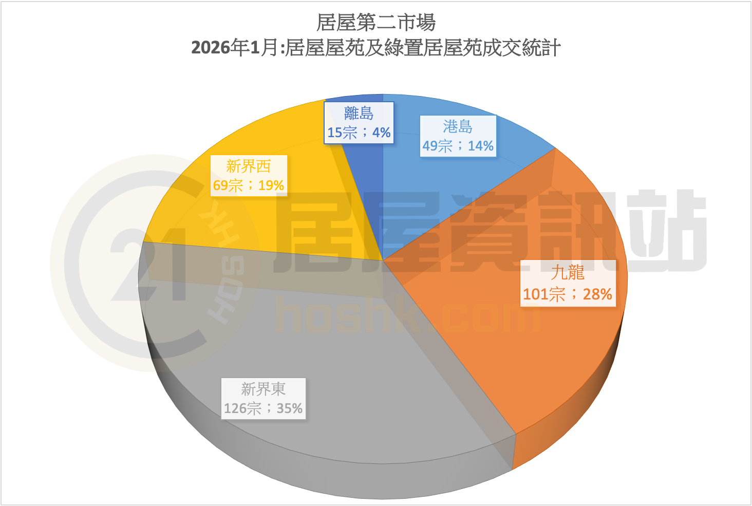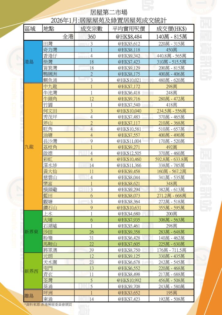 在2026年首個月份中,居屋第二市場成交買賣,共360宗,新界東成交宗數最多,合共126宗,1月份該區一手市場成交活潑,相信亦有帶動到居屋二手市場的成交。其餘地區方面,港島成交宗數:49宗;九龍成交宗數:101宗;新界西成交宗數:69宗;離島成交宗數:15宗。