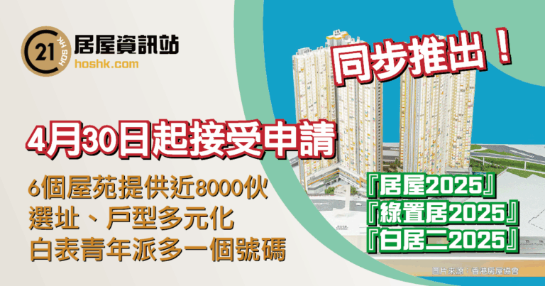 「居屋2025」、「綠置居2025」及「白居二2025」同步推出 4.30起接受申請 近8千伙 選扯、戶型多元化 白表青年申請者多派一個抽籤號碼